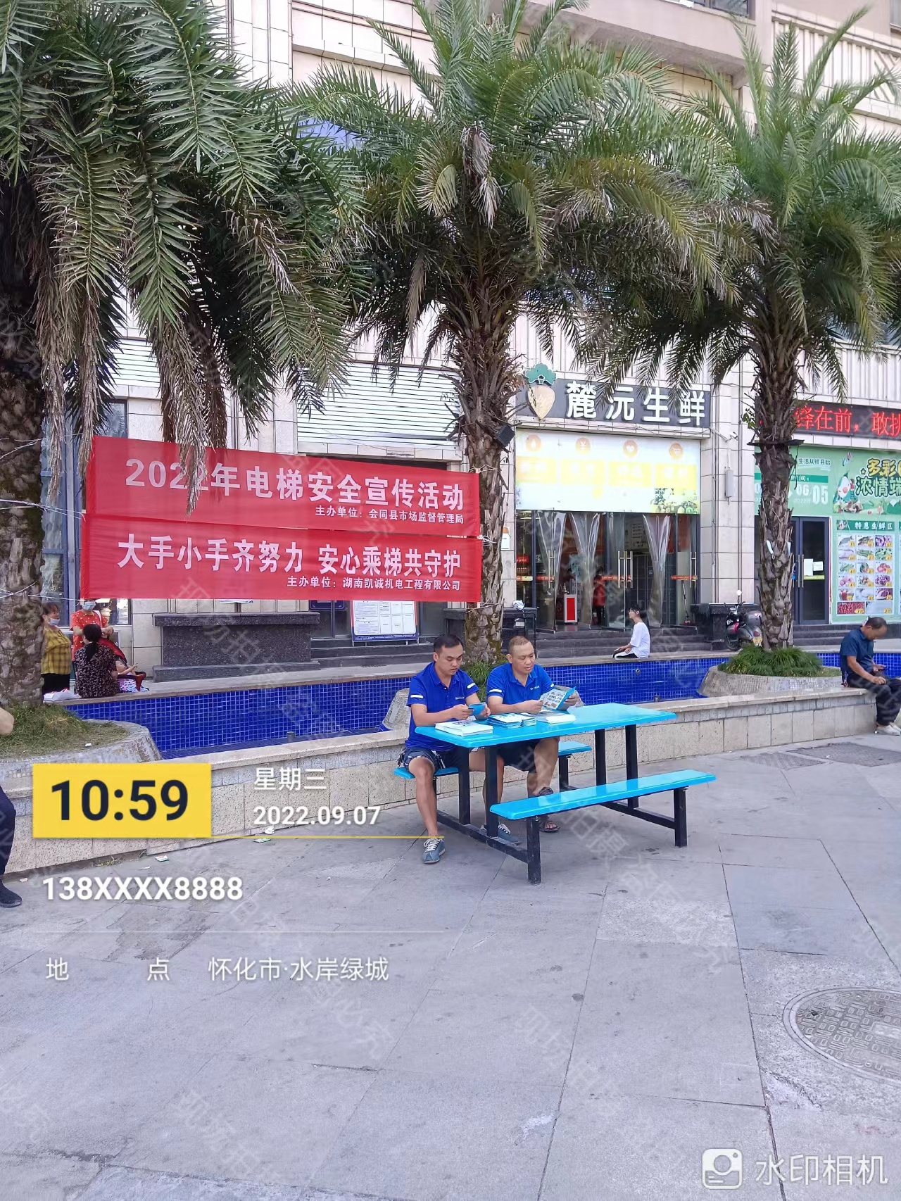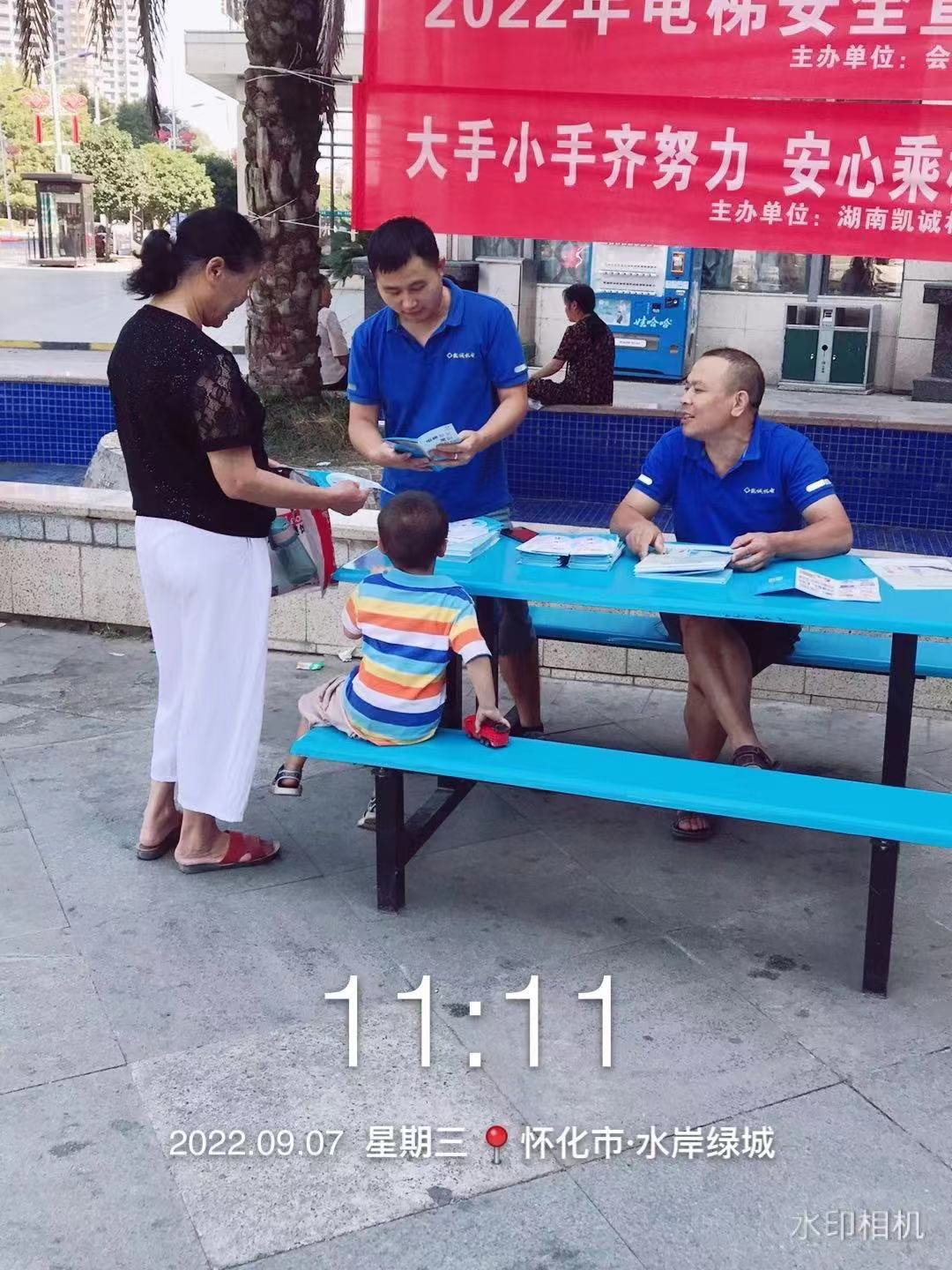 三、電梯知識(shí)宣傳進(jìn)小區(qū) 為了進(jìn)一步普及住宅小區(qū)電梯安全常識(shí),增強(qiáng)業(yè)主對(duì)特種設(shè)備安全知識(shí)的了解與掌握,有效降低電梯安全事故的發(fā)生機(jī)率,湖南凱誠(chéng)機(jī)電工程有限公司于9月7日在會(huì)同水岸綠城就電梯安全運(yùn)行與預(yù)防,相關(guān)科普知識(shí),向業(yè)主進(jìn)行現(xiàn)場(chǎng)宣傳、普及、咨詢(xún)與解答活動(dòng)。
